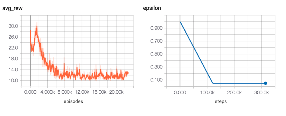agent.action() and agent.learn()While I think obsession over what tools (i.e. which editor to use) is unhelpful, I do think that anyone who takes their work seriously should take pride in the toolset they use. For this experiment I used a combination of tmux, vim, an info & debug log and Tensorboard to try get an understanding of what’s going on.