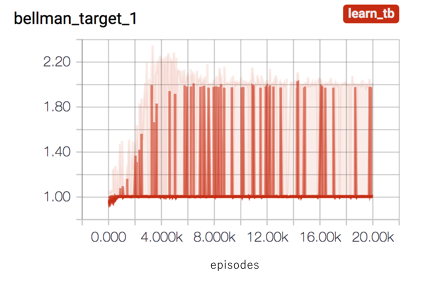From experience with DQN and Cartpole I expected to see a inflation in the Q values. This optimism comes from the max operation over Q(s',a) in the Bellman target. When I took a look at the Bellman target I saw something quite different - an increase until a small value of around 2.0. Since rewards for Cartpole are +1 for each step, this meant that the max across Q(s',a) was approximately 1.0 as well.