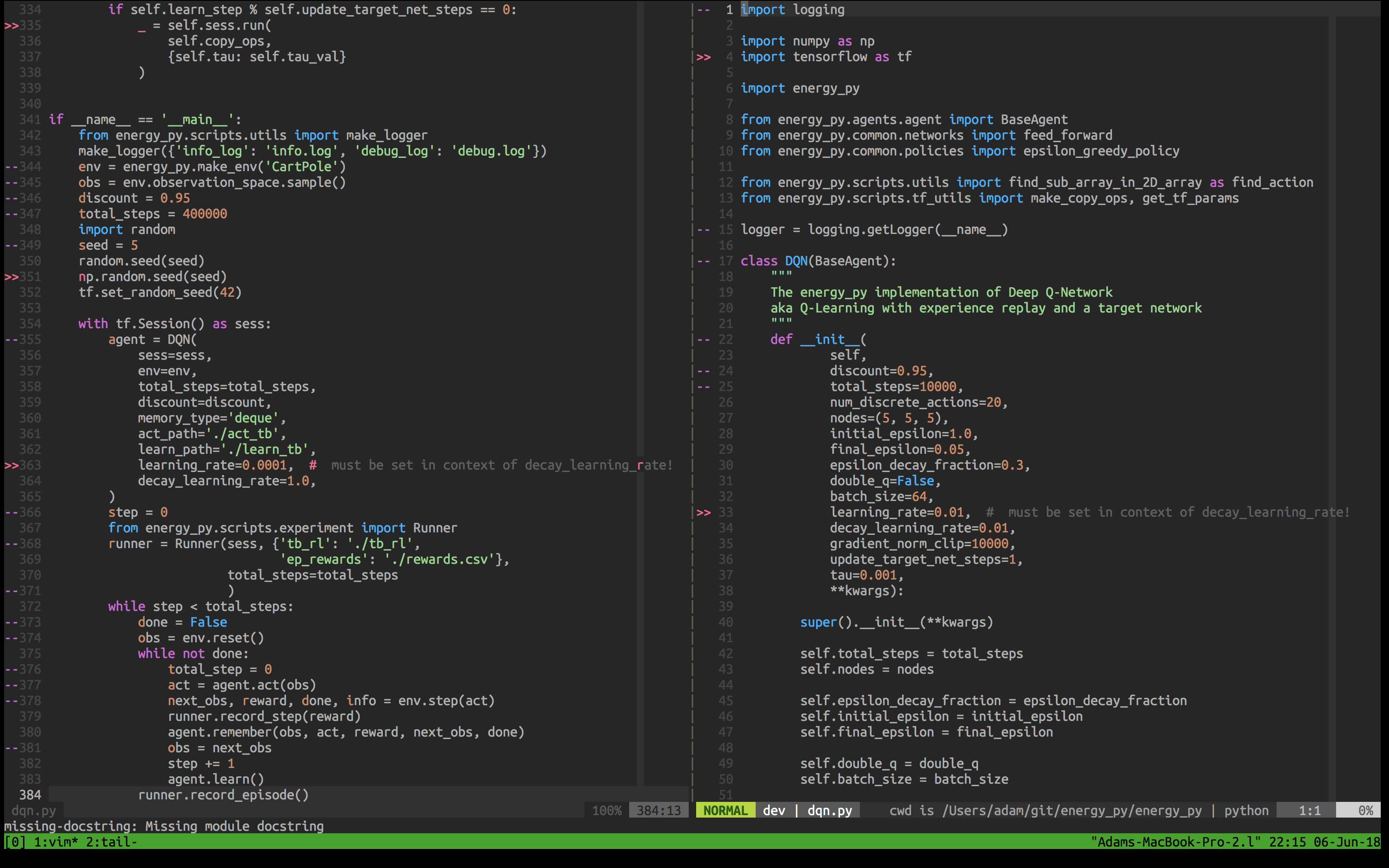 I used two tmux windows, one that kept track of the experiment and another with the energy-py/agents/dqn.py script open for editing in vim. The experiment window shows both the info.log and debug.log. The debug log moves too fast to be viewed but is useful for seeing if the agent is working.
