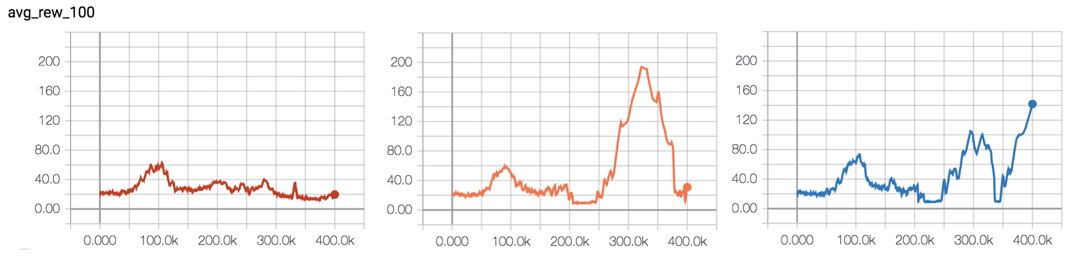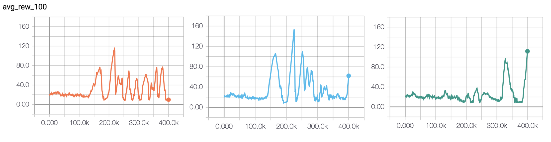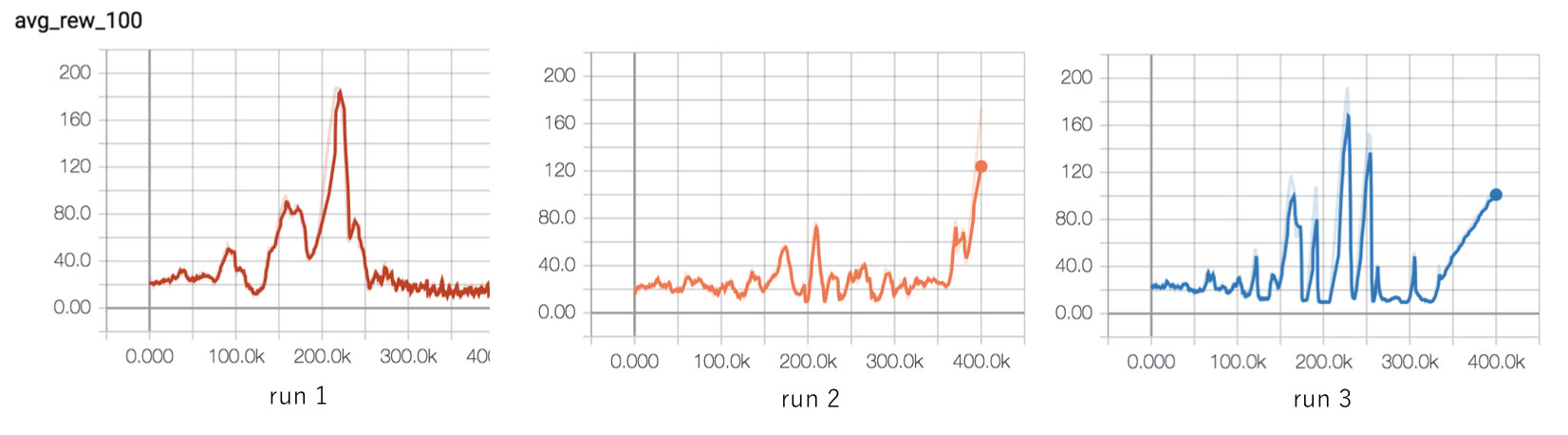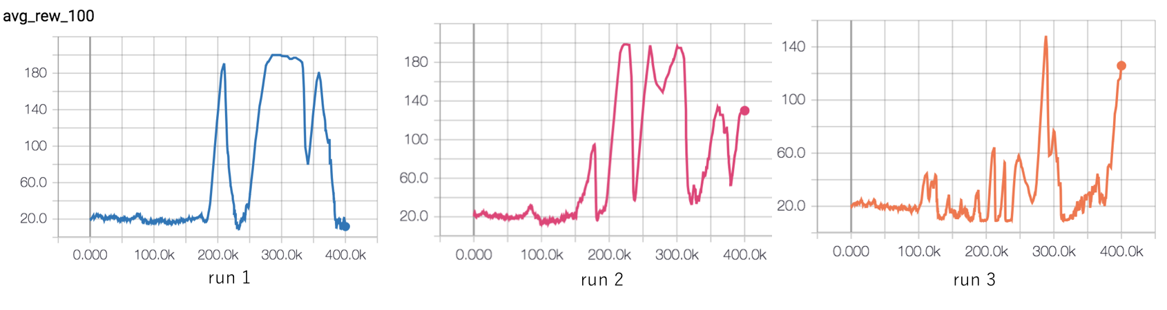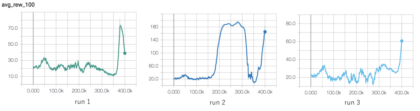 All three runs also show catastrophic forgetting - i.e. after they solve the environment they all managed to forget their good work. What then is the solution to this?