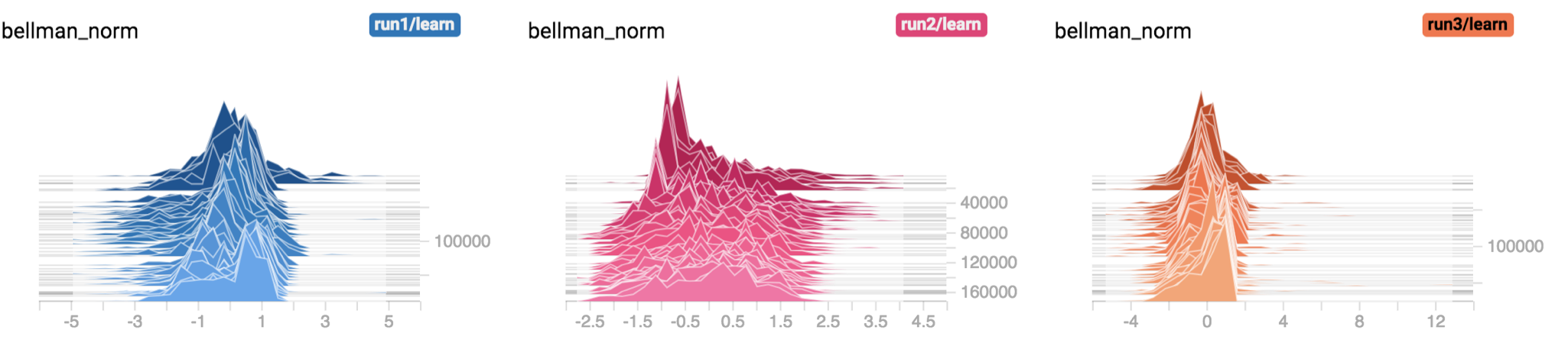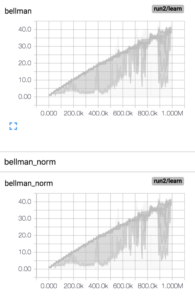)Figure 6 shows the batch normed Bellman target with training=True (i.e. normalize each batch using the batch statistics) for the runs show in Figure 5 above. Figure 7 shows the Bellman target with training=False.