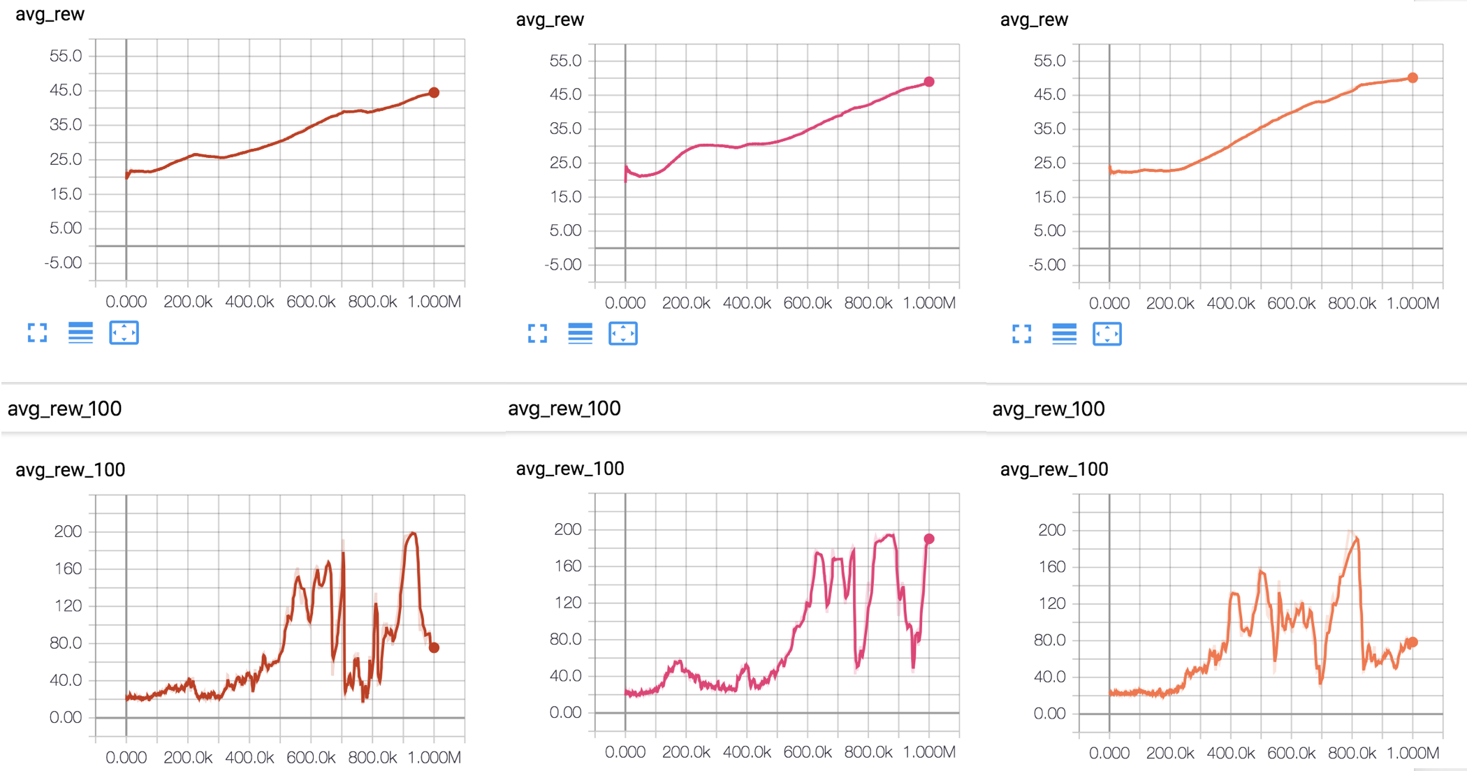 layers = 5, 5, 5The results across three random seeds are shown in Figure 1.