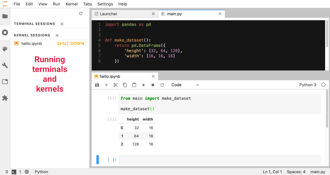 Unlike Jupyter Notebook, you can have multiple tabs open side by side - you can also keep track of your kernels by selecting Running Terminals & Kernels in the sidebar: