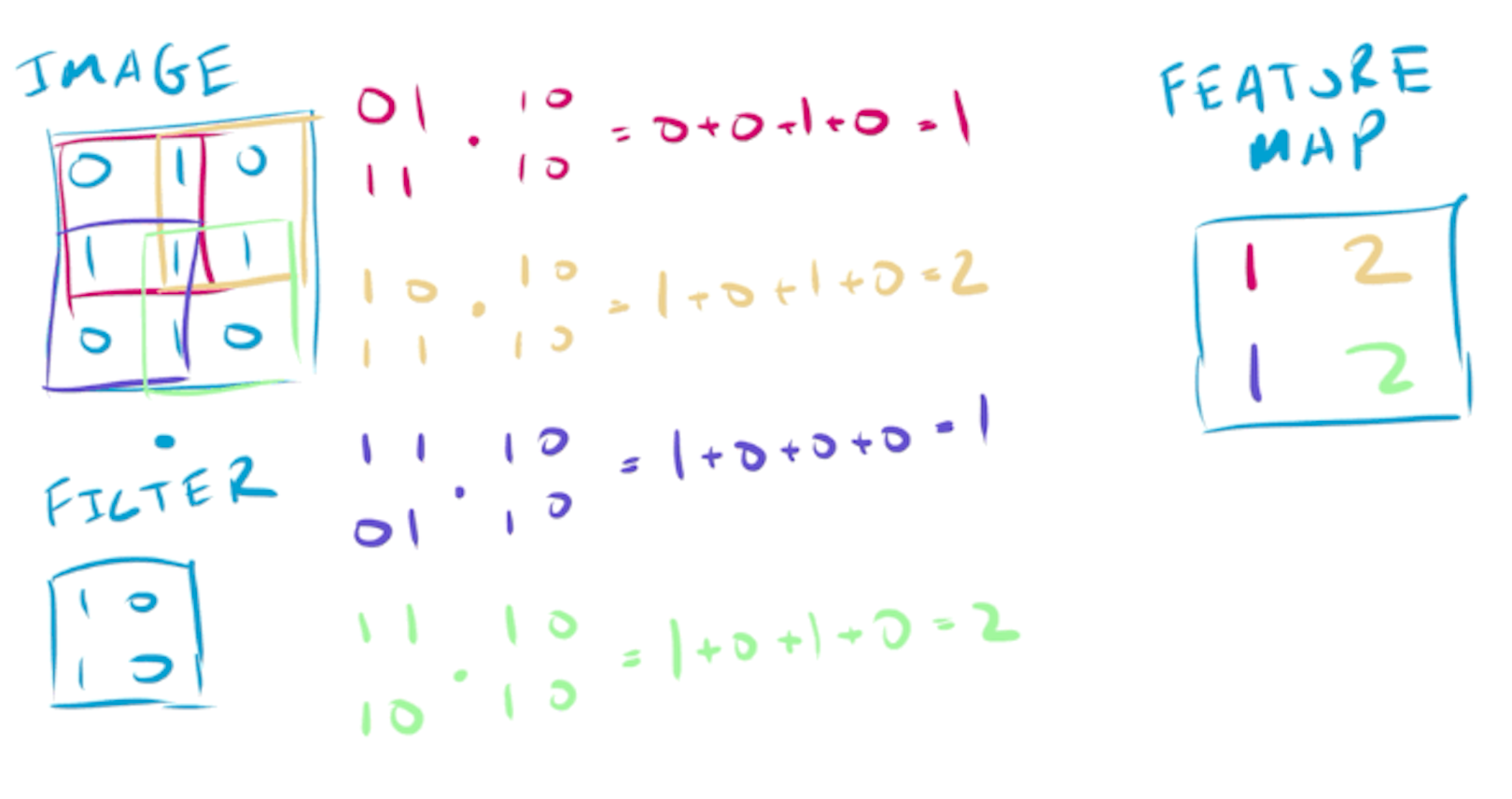 For larger images (which are often 32x32 or larger), this same basic operation is performed, with the filter being passed over the entire image. The output of this operation acts as feature detection, for the filters that the network has learnt, producing a 2D feature map.