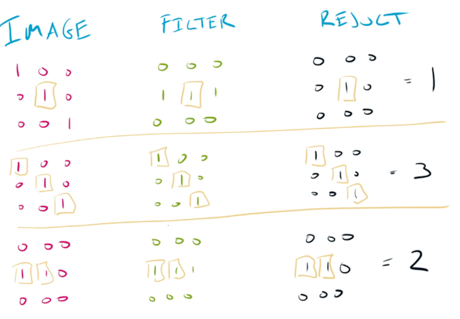 This checking process is pattern recognition, and is the intuition behind convolution - looking for small, spatial patterns anywhere in a larger space. The convolution layer has inductive bias for recognizing local, spatial patterns.