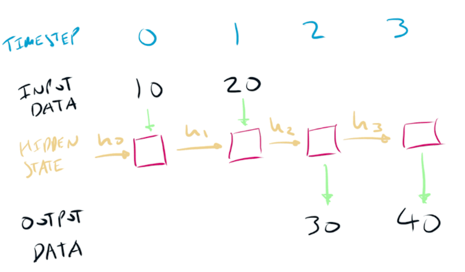 Imagine we have input data $x$, that is a sequence of integers [0, 0] -> [2, 20] -> [4, 40]. If we were using a fully connected layer, we could present this data to the network as a flat array: