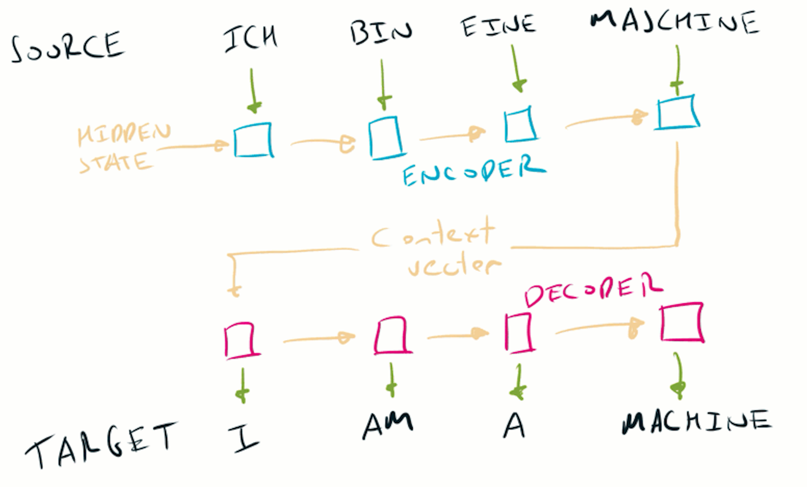 Take the example of machine translation, to translate the German sentence Ich bin eine Machine into the English I am a machine.