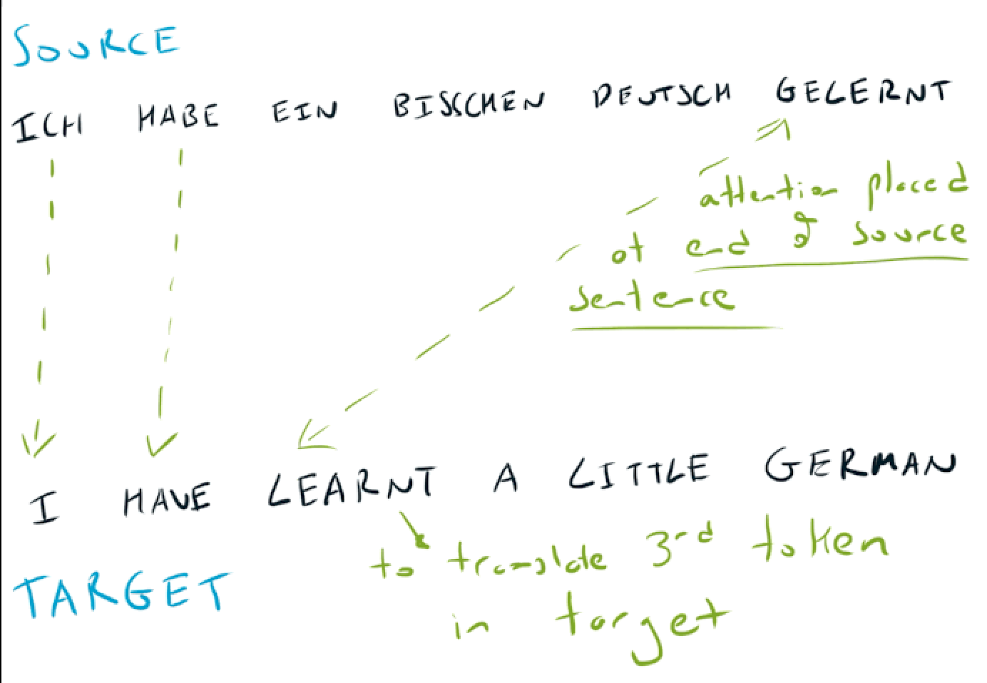If we take a more complex example of translating the German Ich habe ein bisschen Deutsch gelernt into the English I have learnt a little German. When predicting the third token of our English sentence (learnt), attention should be placed on the last token of the German sentence (gelernt).