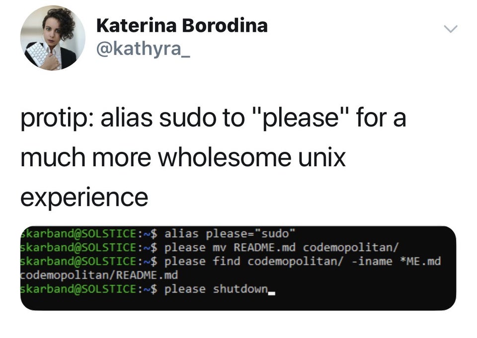 CMD ["python", "app.py"]$ file=data.csv python process_data.py "$file" > "${file%.csv}_processed.csv"$ sqlite3 db.sqlite "SELECT * FROM users"Bash is an enabling skill - it enables workflows that have huge benefits for development: