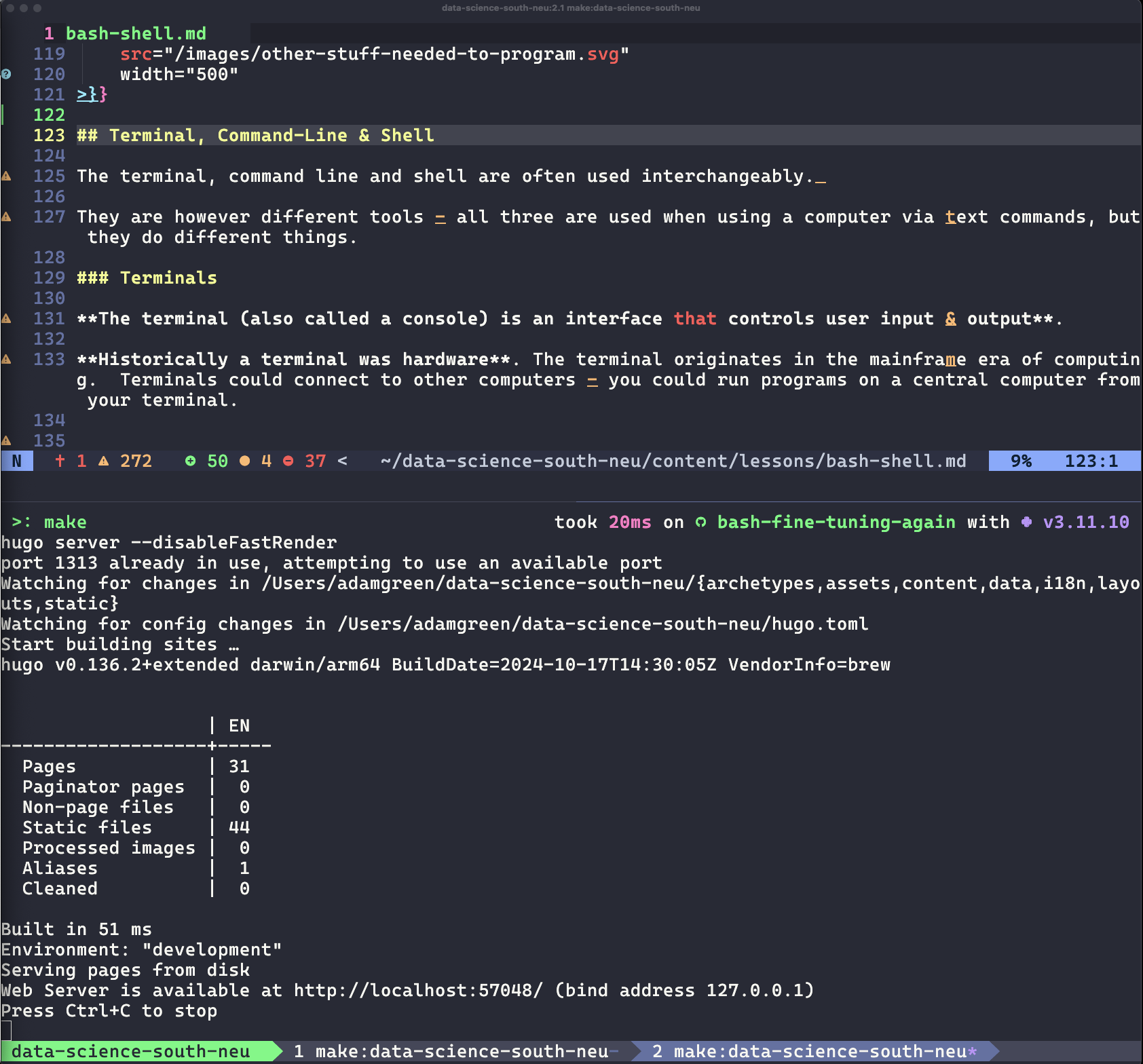 echo "hello from a script".bashrc, .zshrc, and other configuration files$PATHcd, pwd, and using keyboard shortcuts like tab completion and CTRL-Rtouch, cat, mv, rm and more|, >, >>, and < to build powerful command pipelinesThese skills form the foundation for many data science workflows, enabling everything from automated data processing to CI/CD pipelines and Docker deployments.